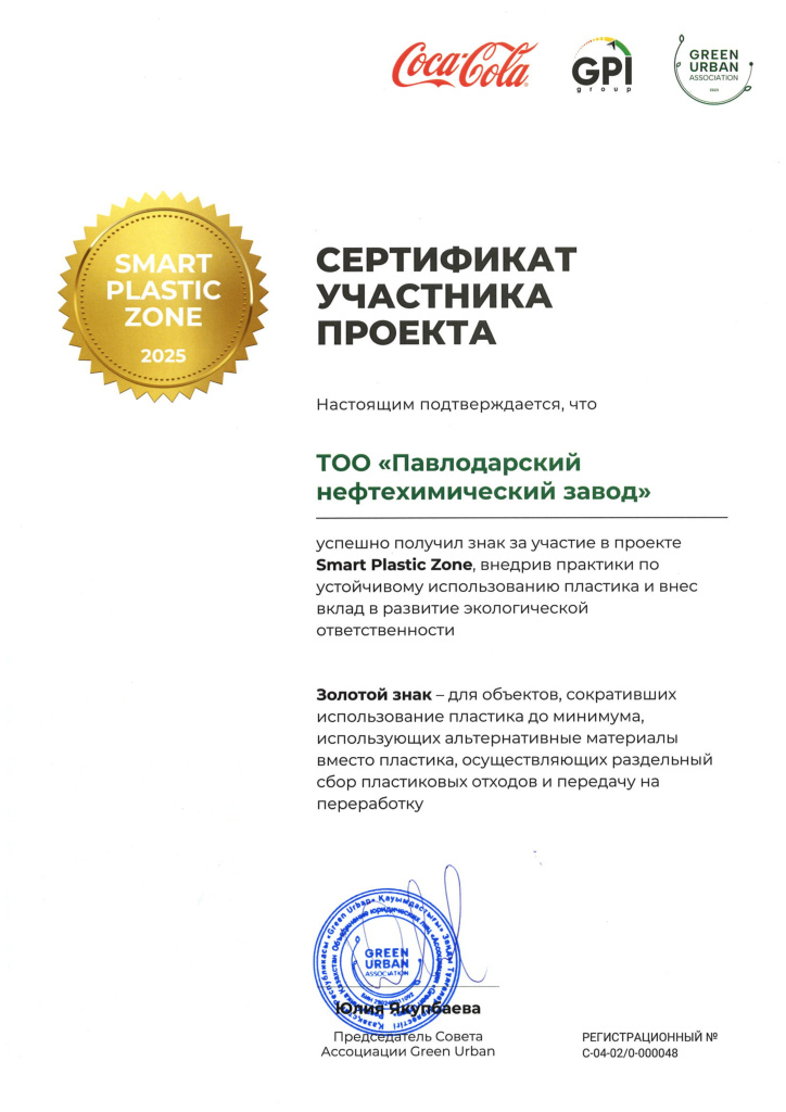 Золотой сертификат Smart Plastic Zone подтверждает, что высокие экологические стандарты ПНХЗ — это не формальность, а устойчивая ежедневная практика.